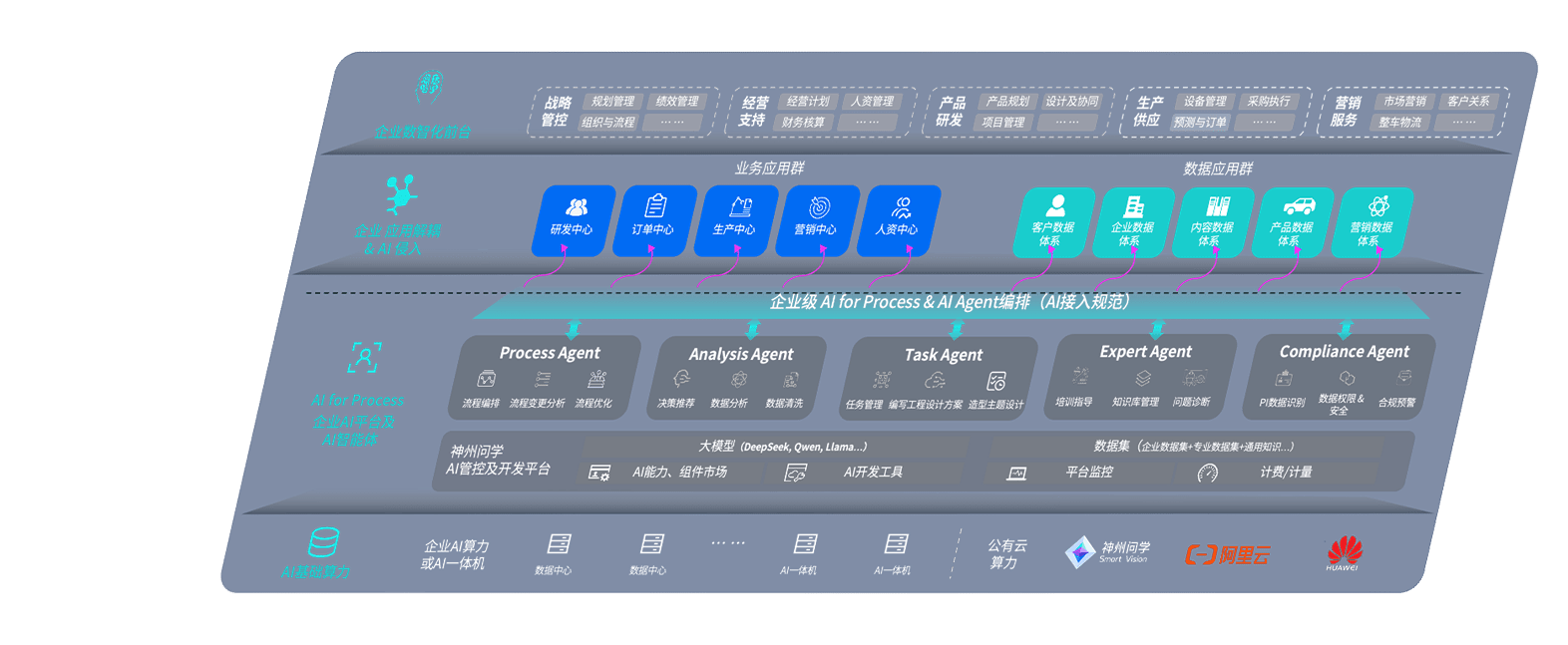 端到端的一站式AI工作空间深度融合了从企业战略规划到日常经营的全流程业务板块,,,定向解决车企内部领域多、、、部门多、、、链条长、、场景碎片化等难题,,支持车企快速构建以AI为核心的生产力写作体系,,,,实现任务执行与AI能力的无缝集成与交互
