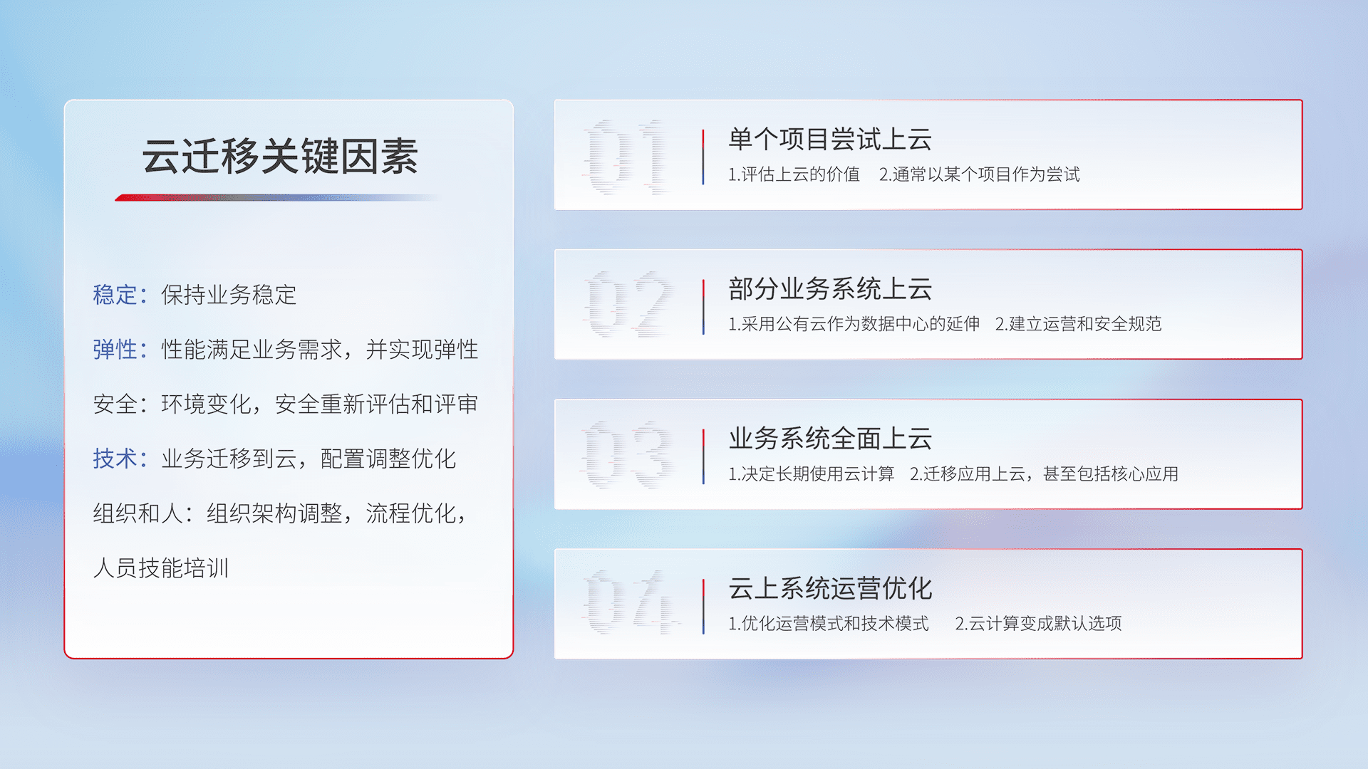 结合实际业务,,从规划设计、、云平台选型、、云原生改造、、数据迁移、、集成交付,,迁移全过程为客户识别最佳上云路径,,,,做好风险识别管理,,,设计网络架构、、身份权限、、、、安全审计合规、、、、操作审计、、、、日志审计、、监控告警策略、、多站点容灾设计等,,对云上基础设施进行整体规划,,,,提升IT治理水平,,,以满足弹性、、、、高可用、、、高性能的需求。。。。