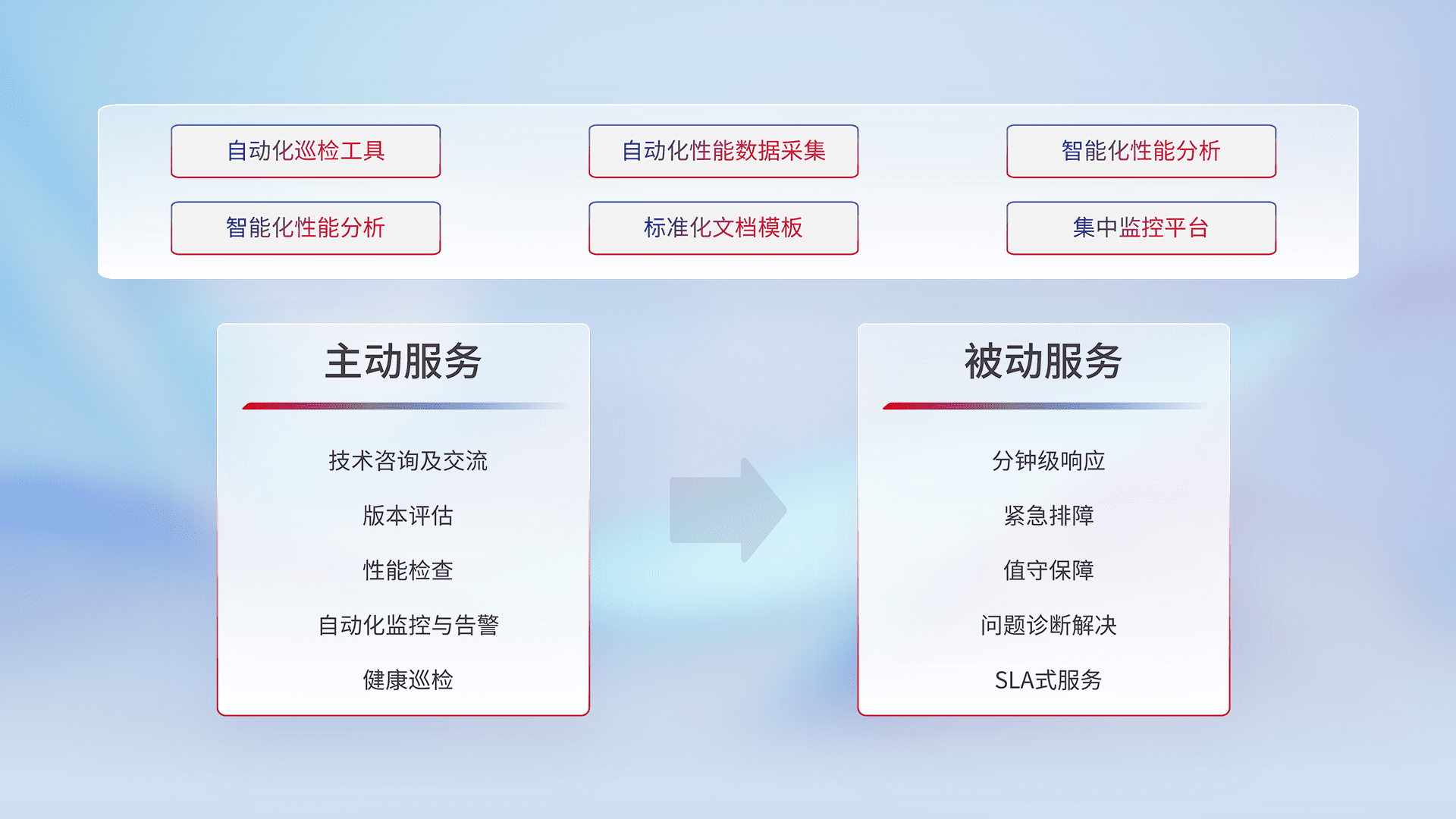 智能化工具和标准化文档,,,,保障服务质量,,,提供主动服务(包含技术咨询、、版本评估、、、性能检查、、、自动化监控与告警、、、、健康巡检)和被动服务包含(分钟级响应、、紧急排障、、、值守保障、、、问题诊断解决、、SLA服务)。。。。