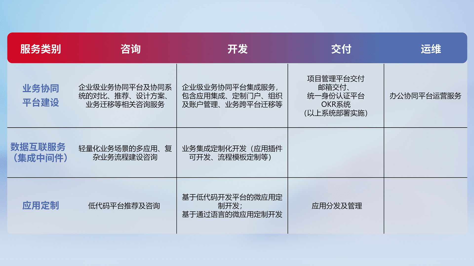 针对钉钉、、企微、、、、IDaas等平台级产品提供产品的规划、、、方案、、、交付、、、定制化开发等服务,,,,实现如统一协同办公、、智能客户服务、、混合会议管理、、智能数据查询、、等业务场景,,,,实现数字化转型。。。。